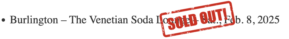 - Burlington – The Venetian Soda Lounge – Sat., May 17, 2025